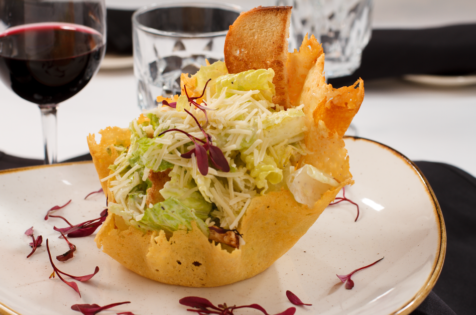 heart of romaine lettuce Caesar dressing tossed with Parmesan cheese, crostini, and black pepper
