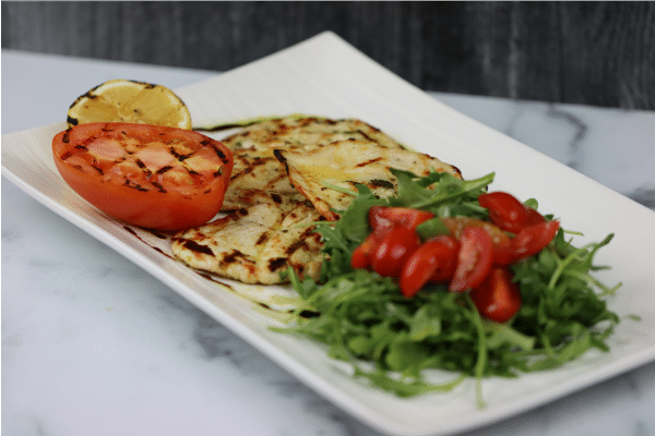 Pounded and grilled chicken breast topped with arugula, tomato salad tossed with balsamic